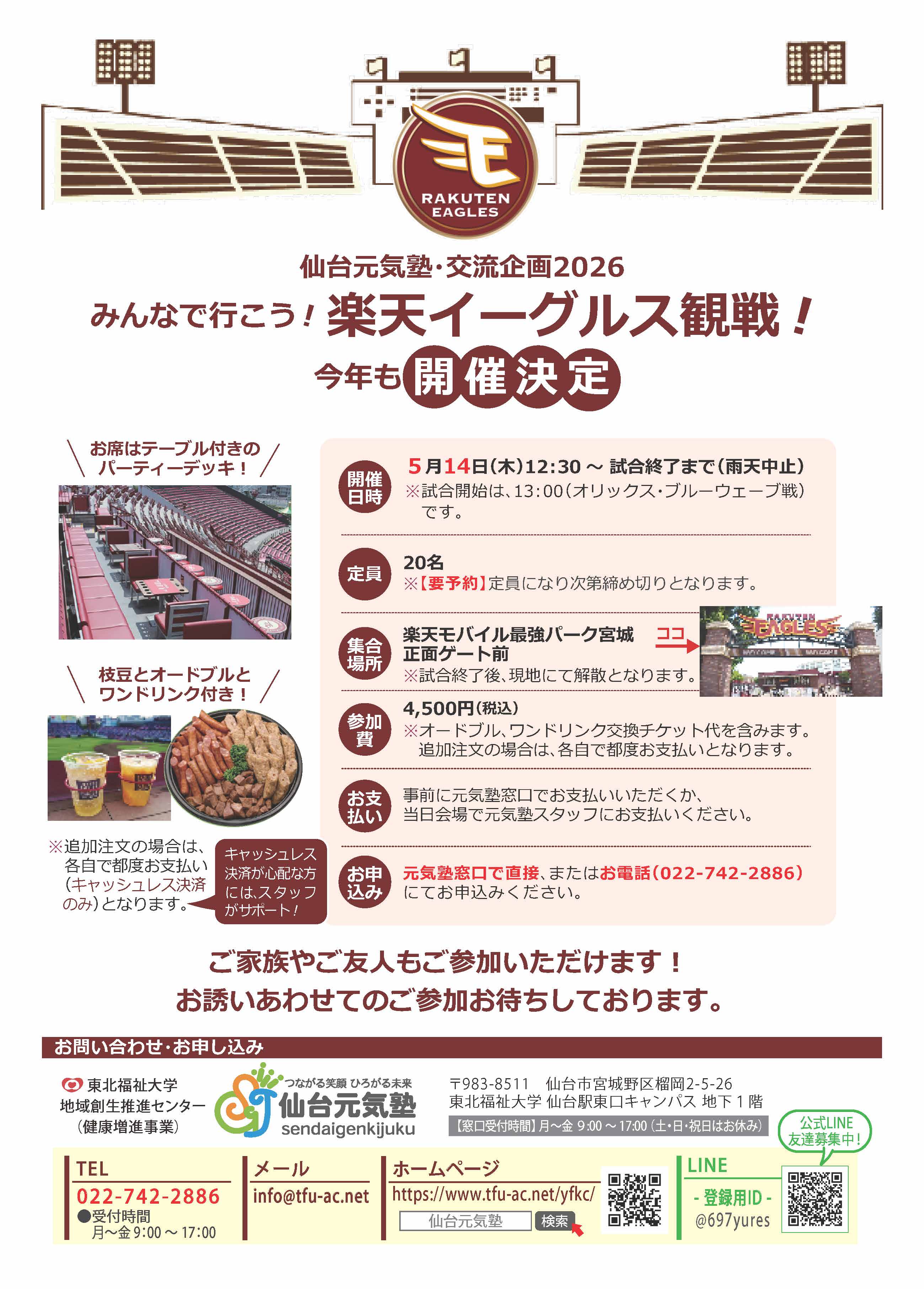 仙台元気塾 交流企画・春《みんなで行こう!楽天イーグルス観戦!》開催決定